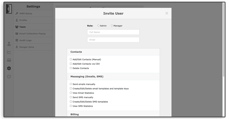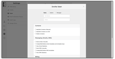 Invite team members to manage your Send With SES account. Manage access through granular permissions. Actions by team members are logged for your internal audit purposes.