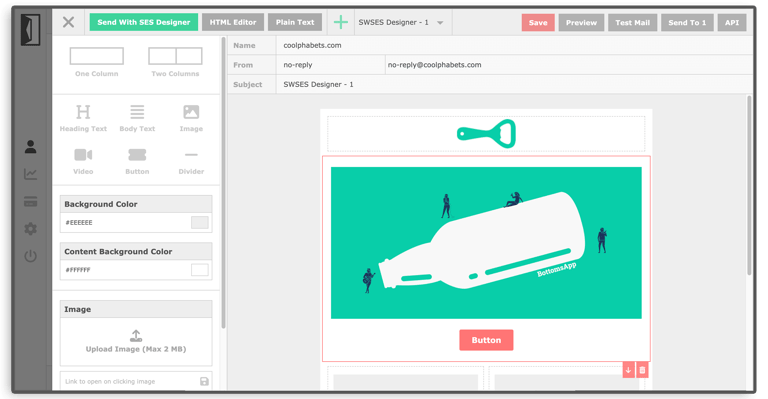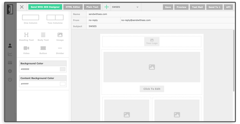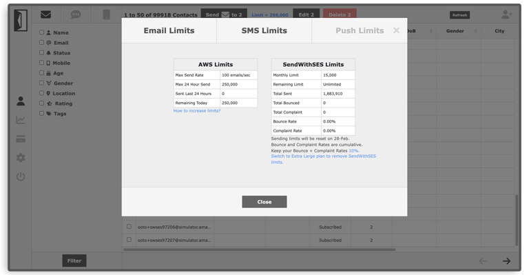 Send With SES integrates with your AWS SES account to send transactional and marketing emails. You can send emails manually via the dashboard or programmatically by calling the API or by using workflow rules.