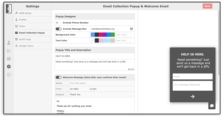 Include the customer support popup into your app with a single line of code. Customer messages can be forwarded to an email destination of your choice where you can handle customer queries.