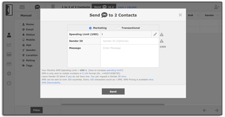 Send With SES integrates with your AWS SNS account to send transactional and marketing SMS (Text Messages). You can send SMS manually or via the API to 200 + countries and regions around the world.